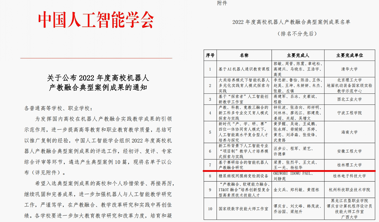 近日,中国人工智能学会发布《关于公布2022年度高校机器人产教融合典型案例成果的通知》,beat365机械与控制工程学院教师团队成果《基于赛研结合的智能机器人产教融合研究》成功入选。