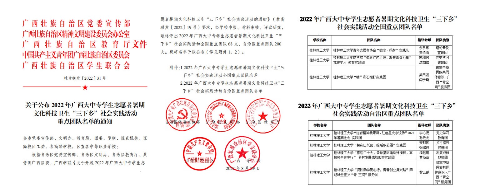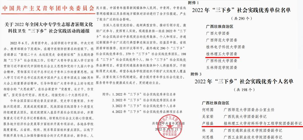 近日,共青团中央青年发展部对在2022年全国大中专学生志愿者暑期“三下乡”社会实践活动中表现突出的集体、团队和个人进行通报表扬,beat365团委荣获2022年全国大中专学生志愿者暑期文化科技卫生“三下乡”社会实践活动优秀单位称号,材料科学与工程学院卢桂盛老师获评社会实践优秀个人。在2022年广西大中专学生志愿者暑期“三下乡”社会实践活动通报中,商学院“追寻红色足迹,凝聚青春力量”党史学习教育实践团获评优秀团队,地球科学学院“六年传承,四大计划,致力服务少儿地学科普启蒙教育”项目获评优秀品牌项目。