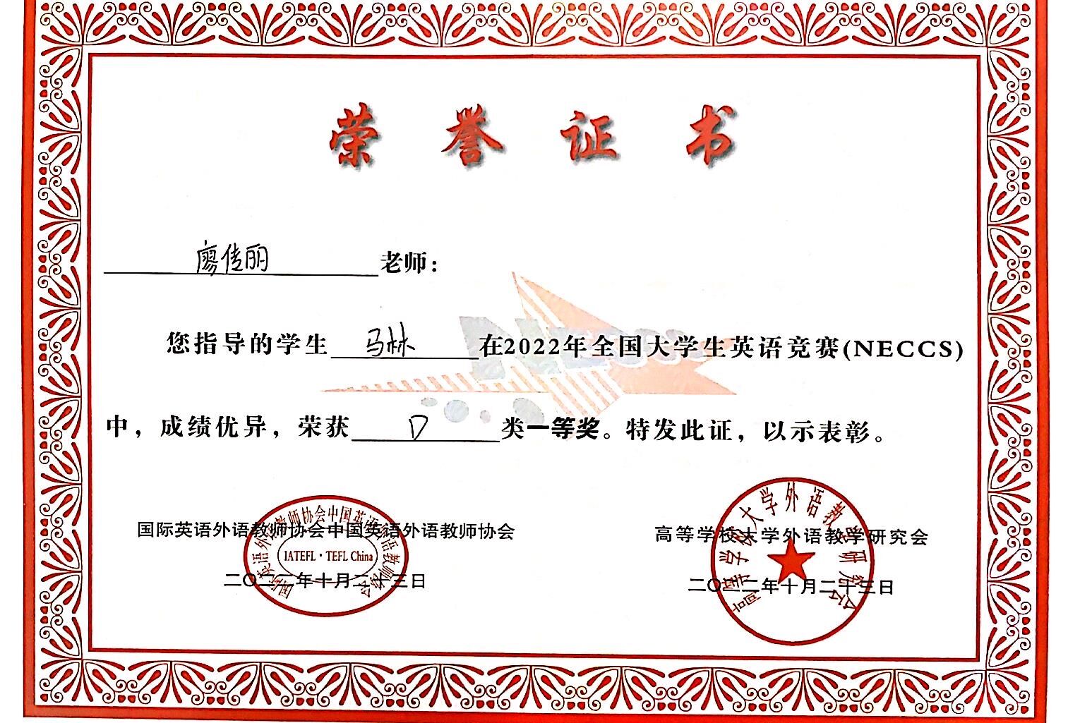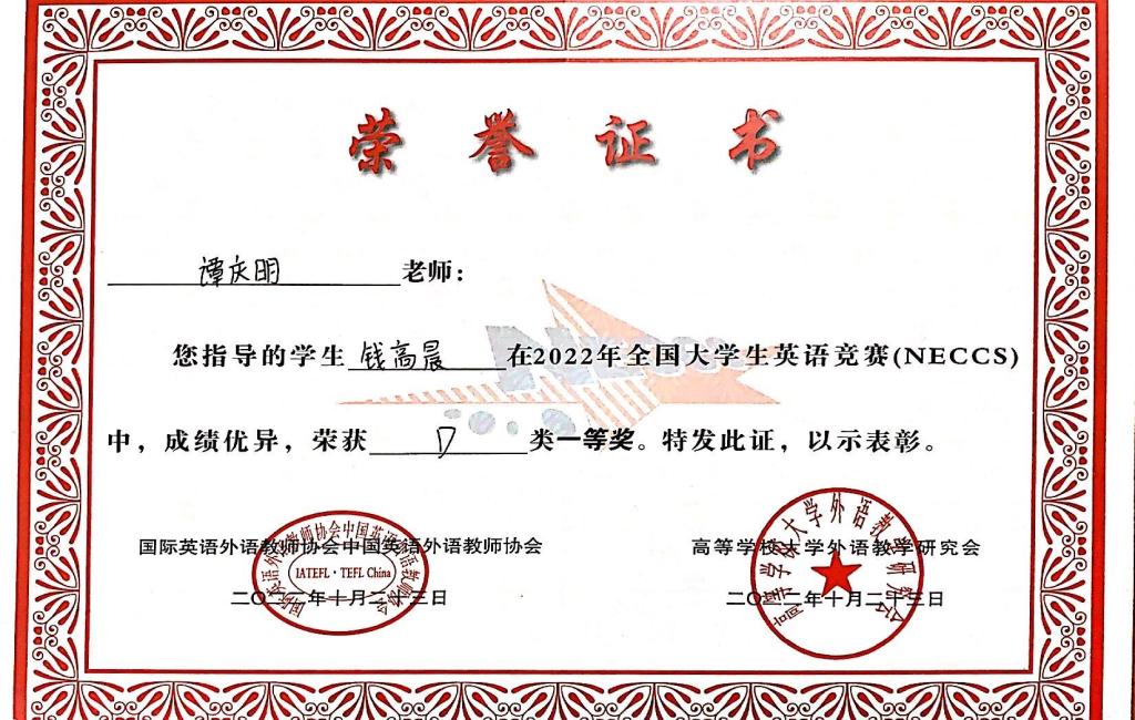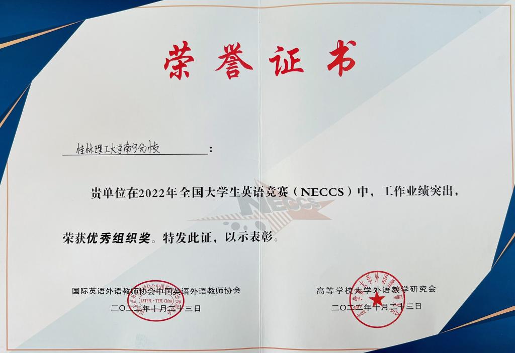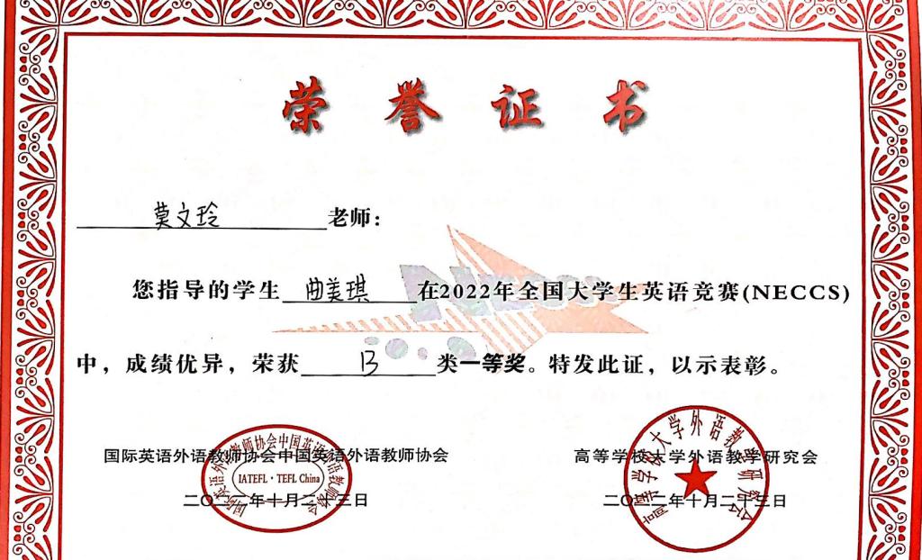 近日,南宁分校学生在2022年全国大学生英语竞赛中荣获区级一等奖5项,其中D类(高职非英语专业)一等奖3项、C类(本科非英语专业)一等奖1项、B类(英语专业)一等奖1项,南宁分校荣获优秀组织奖。
