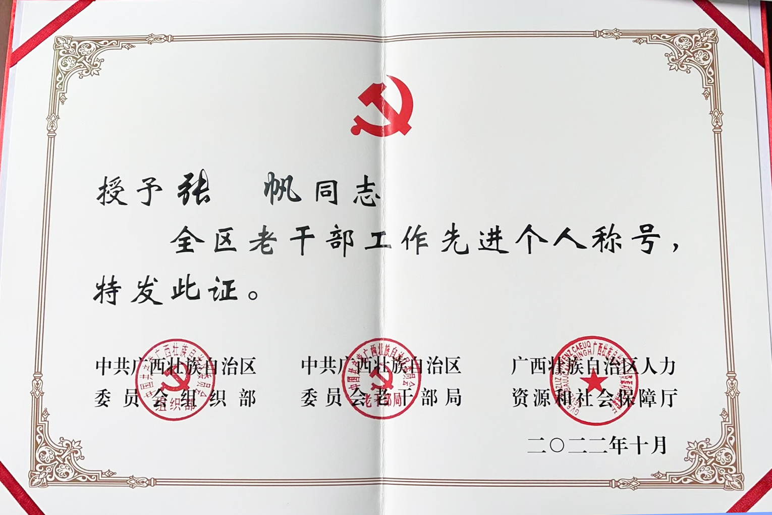 张帆同志荣获“全区老干部工作先进个人”称号