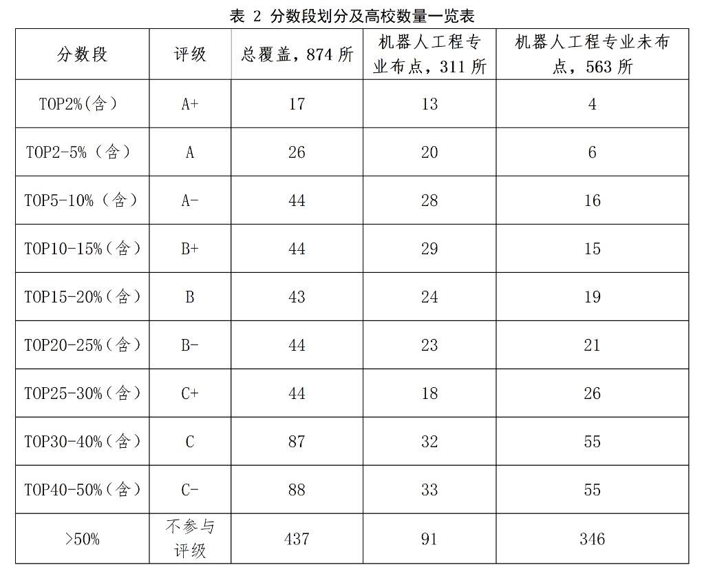 本轮发布的全国普通高校机器人竞赛指数共采集了25项高校机器人相关竞赛共216640条数据(其中参赛数据188945条,获奖数据27695条),时间截止到2022年8月31日,从获奖贡献、参赛贡献两个维度构建评估模型,并对分数位于前50%的学校进行评级,划分为A+、A、A-、B+、B、B-、C+、C、C-等九个等级,对前50%的学校分省列出省内排序。