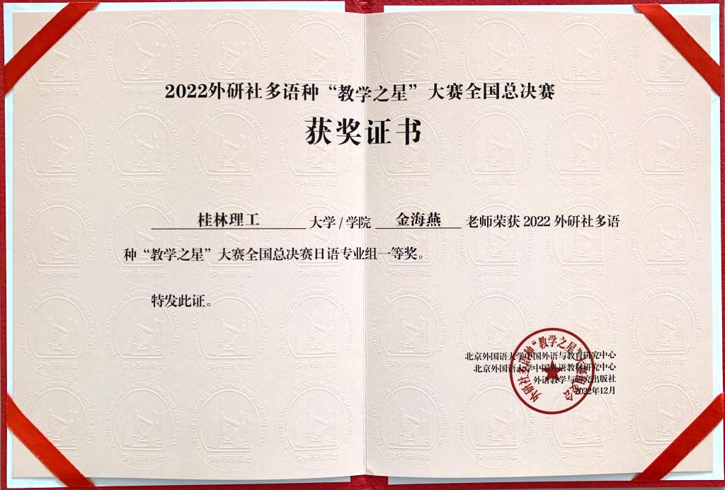 2022年12月20日,由北京外国语大学中国外语与教育研究中心、北京外国语大学中国外语教材研究中心和外语教学与研究出版社共同举办的2022外研社多语种“教学之星”大赛全国总决赛以线上线下相结合的方式成功举行。在日语专业组比赛中,beat365外国语学院教师金海燕老师以第一名的成绩荣获全国一等奖,刷新了beat365在此项比赛中的最好成绩。