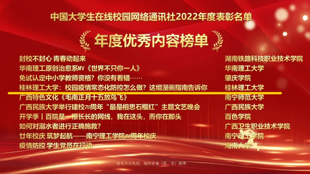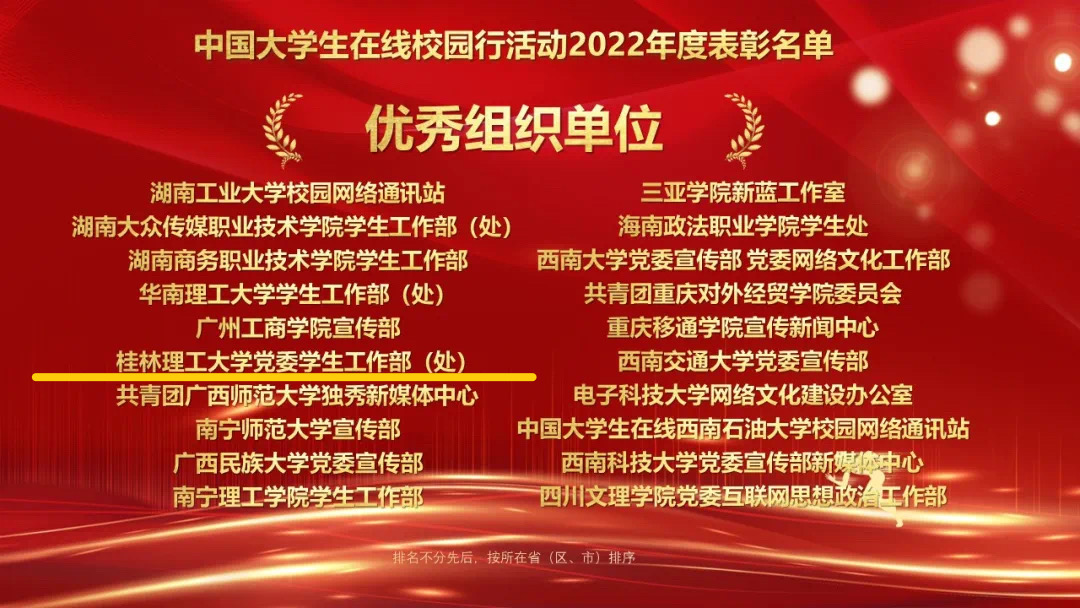 一直以来,学校高度重视教育部中国大学生在线校网通站建设和教育部中国大学生在线“校园行”活动的组织开展,积极配合教育部中国大学生在线开展网络文化主题活动,做到线上线下同频共振,构建立体宣传格局,取得了良好的育人效果。未来,beat365校园网络通讯站将继续坚持以“建设有影响力的校网通站”为基本理念,大力推进网络文化建设和网络思想政治教育阵地建设,以深度推进媒体融合为工作主基调,涵养向上向善的桂工校园文化,共谋网络思政的新领域新赛道,共塑网络育人的新动能新优势,共推学校思政工作取得新进展新成绩。