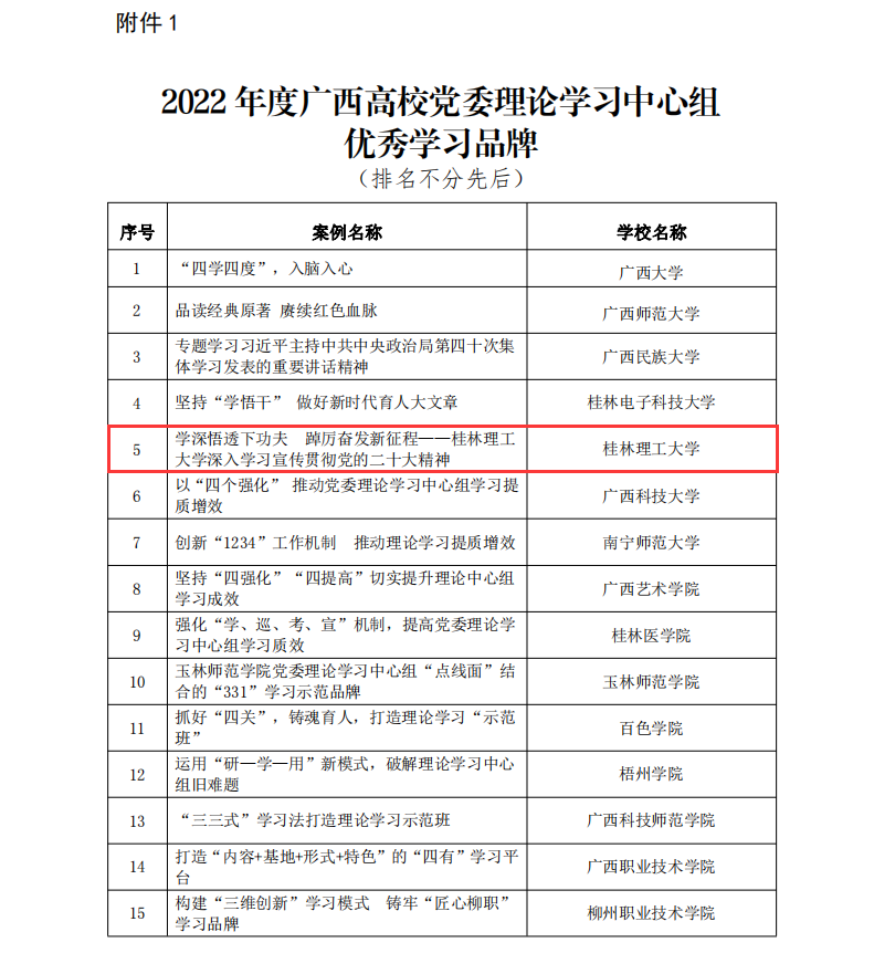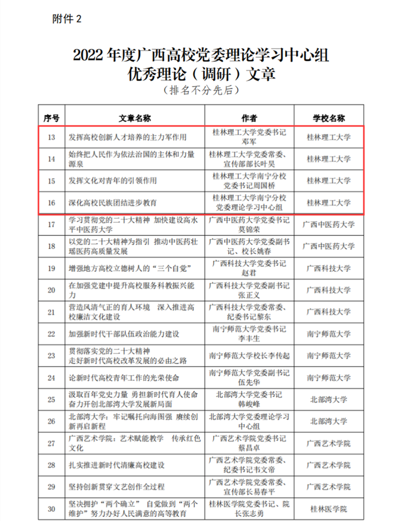 近期,由自治区党委教育工委组织开展的广西高校党委理论学习中心组优秀学习品牌和优秀理论(调研)文章推选活动评比结果揭晓,beat365党委理论学习中心组案例《学深悟透下功夫 踔厉奋发新征程——beat365英国官方网站深入学习宣传贯彻党的二十大精神》,作为全区20所高校党委理论学习中心组优秀案例,入选2022年度广西高校党委理论学习中心组优秀学习品牌。学校党委书记邓军撰写的理论文章《发挥高校创新人才培养的主力军作用》、党委宣传部部长叶昊撰写的理论文章《始终把人民作为依法治国的主体和力量源泉》、南宁分校党委书记周国桥撰写的理论文章《发挥文化对青年的引领作用》、南宁分校党委理论学习中心组撰写的理论文章《深化高校民族团结进步教育》入选2022年度广西高校党委理论学习中心组优秀理论(调研)文章。