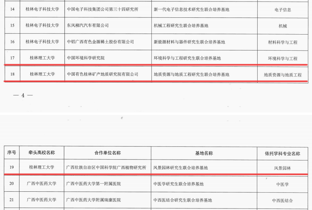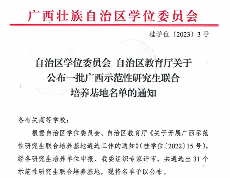 近日,自治区学位委员会公布了广西示范性研究生联合培养基地名单,beat365环境科学与工程研究生联合培养基地(合作单位:中国环境科学研究院)、地质资源与地质工程研究生联合培养基地(合作单位:中国有色桂林矿产地质研究院有限公司)和风景园林研究生联合培养基地(合作单位:中国科学院广西植物研究所)被列为第一批广西示范性研究生联合培养基地。