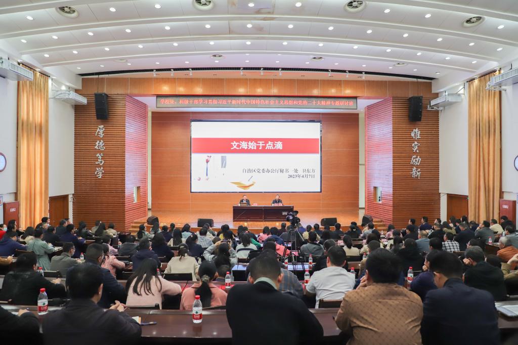 学校党委职能部门全体处级干部、全校科级干部、各学院党委副书记、学工系统全体干部,以及桂林市委保密办(市国家保密局)、市委政研室等部门的同志共约200多人参加了现场学习。学校在南宁分校设置了视频分会场,分校的70多名科级干部参加了线上学习。