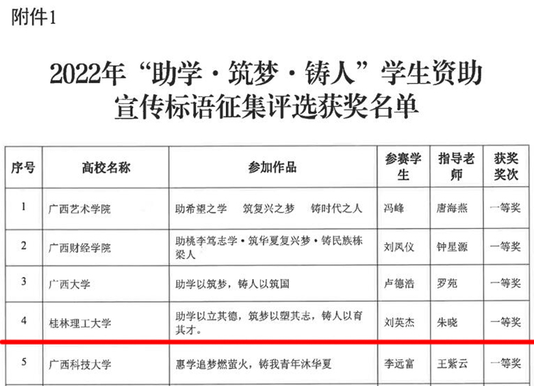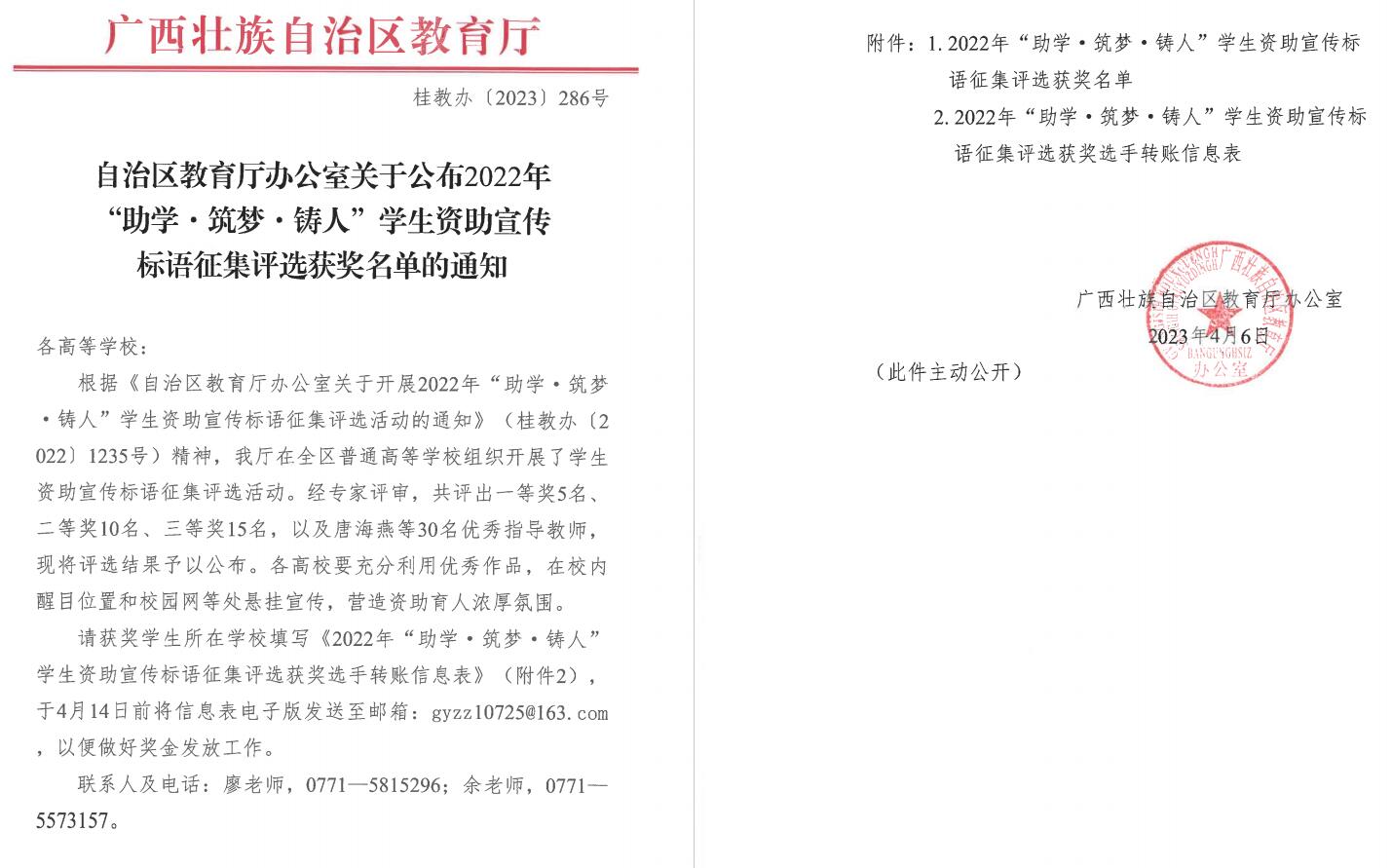 近日,2022年全区“助学·筑梦·铸人”学生资助宣传标语征集评选活动获奖名单公布,beat365公共管理与传媒学院刘英杰同学的作品《助学以立其德,筑梦以塑其志,铸人以育其才》、商学院梁建丽同学的作品《续助学之火,亮筑梦之塔,耀铸人之路》分别荣获一等奖、三等奖,朱晓、王贤两位老师荣获优秀指导老师。