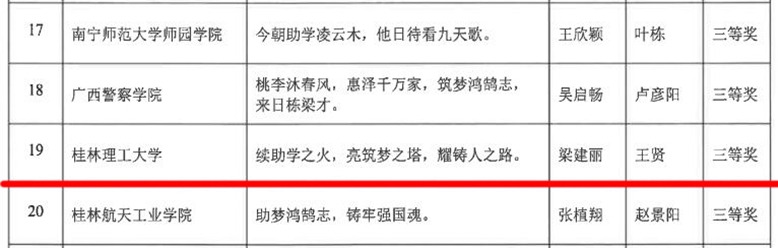 学校学生资助管理中心高度重视此次宣传标语征集评选活动,动员广大学生积极参与,经学院推荐、校内专家评审,择优报送作品到自治区教育厅参评。下一步,学校将不断加强学生资助政策和成效宣传,努力讲好学生资助故事,凝聚资助育人正能量,营造浓厚的资助育人文化氛围,激励广大桂工学子奋发自强、立志成才、诚实守信、感恩奉献。