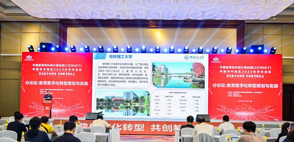 为深入贯彻落实教育部关于教育数字化转型的战略部署,4月14日,中国教育和科研计算机网(CERNET)举行华南华中地区2023年学术会议。来自广东、广西、海南、湖北、湖南、河南六省区各级政府教育主管部门的领导、全国高校信息化专家、六省区CERNET会员单位代表、企业代表等700余人齐聚琼海,共话教育数字化转型之路。beat365作为CERNET会员单位选派网络与信息中心教师参加了本次会议,并代表广西高校在大会发言分享学校教育数字化转型理念和成效。