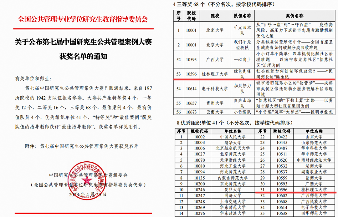 据悉,中国研究生公共管理案例大赛由教育部学位管理与研究生教育司指导,中国学位与研究生教育学会、中国科协青少年科技中心及全国公共管理专业学位研究生教育指导委员会联合举办。大赛旨在引导我国研究生关注公共管理实际问题,提高其运用相关理论和方法解决实际问题的能力,同时在公共管理高等教育中推广案例教学方法,增进高等院校与实践部门互动。