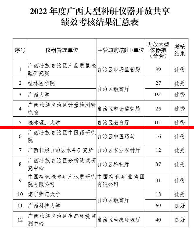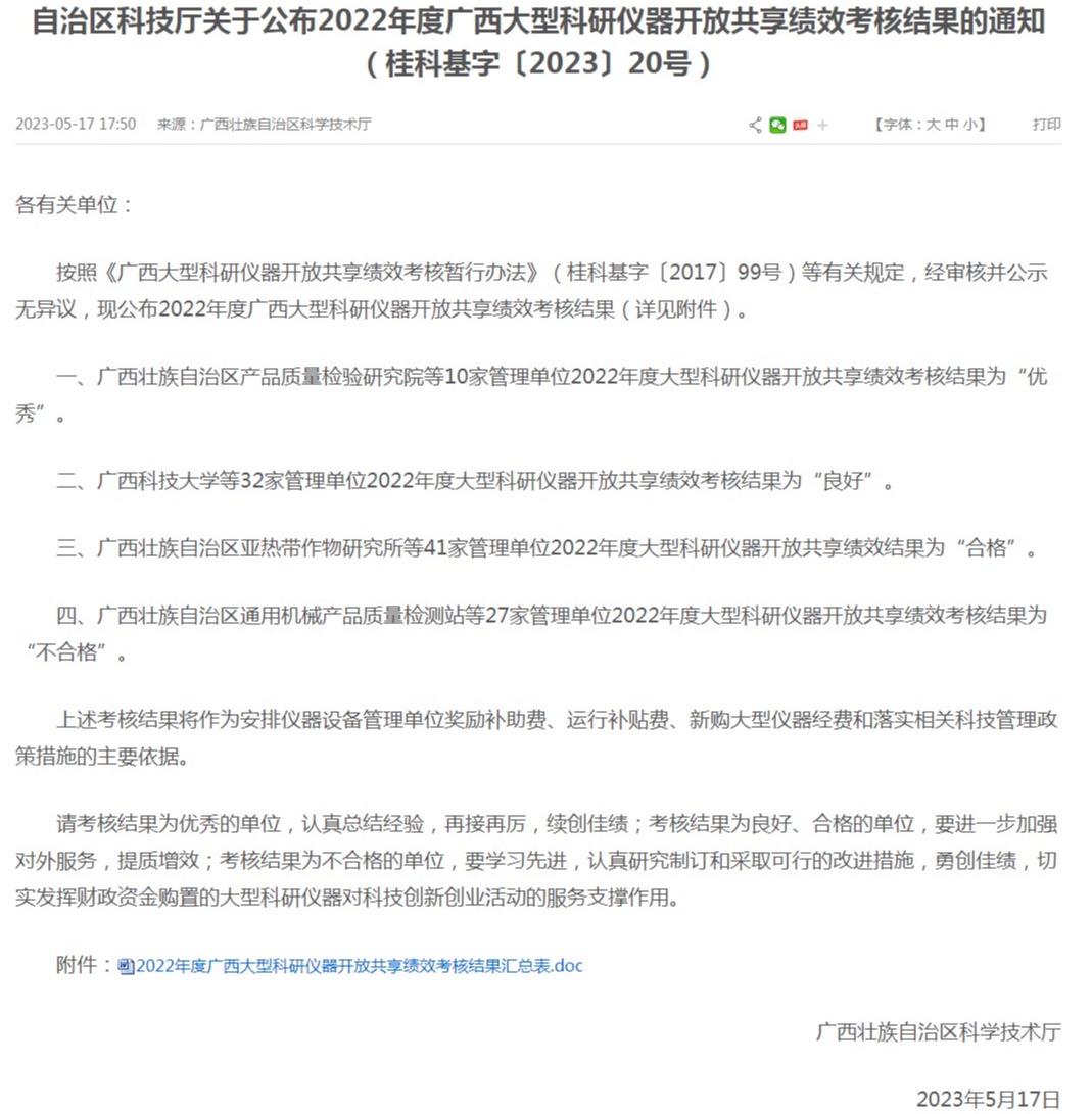近日,根据自治区科技厅发布《2022年度广西大型科研仪器开放共享绩效考核结果的通知》,beat365在2022年广西区大型科研仪器设备共享绩效考核中获得优秀,这也是beat365自2020年以来,连续三年获此荣誉。