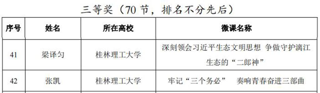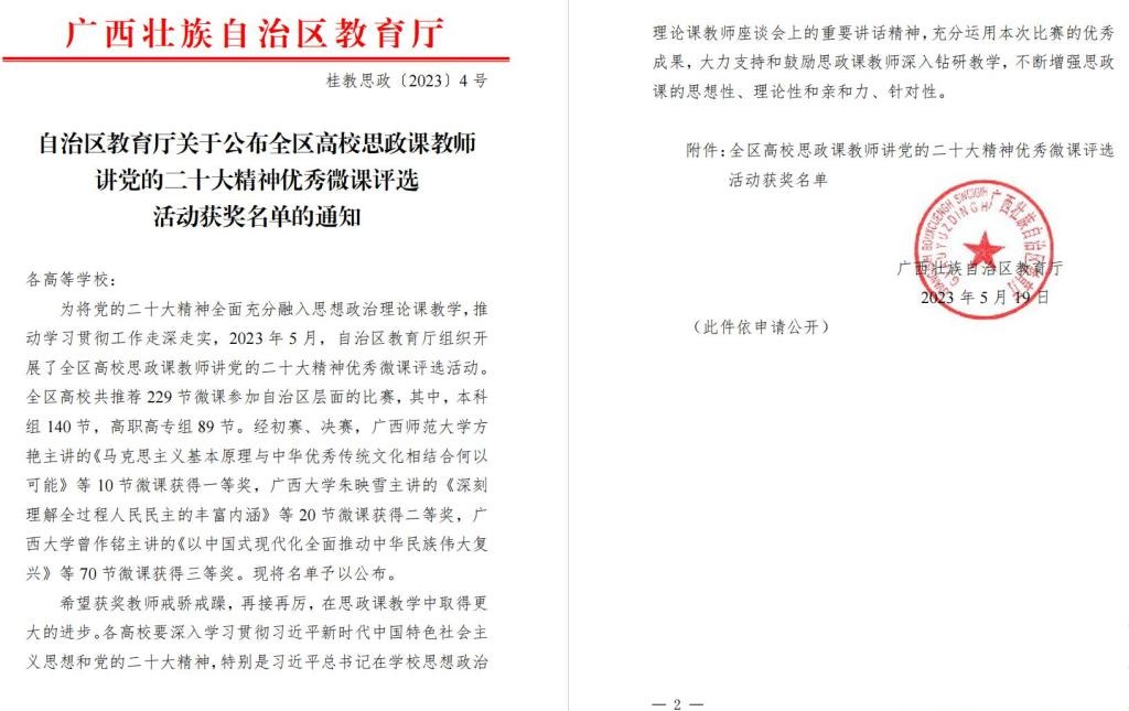 近日,自治区教育厅公布了全区高校思政课教师讲党的二十大精神优秀微课评选活动获奖名单,beat365商学院教师梁译匀讲授的微课《深刻领会习近平生态文明思想 争做守护漓江生态的“二郎神”》、南宁分校教师张凯讲授的微课《牢记“三个务必” 奏响青春奋进三部曲》荣获全区三等奖。