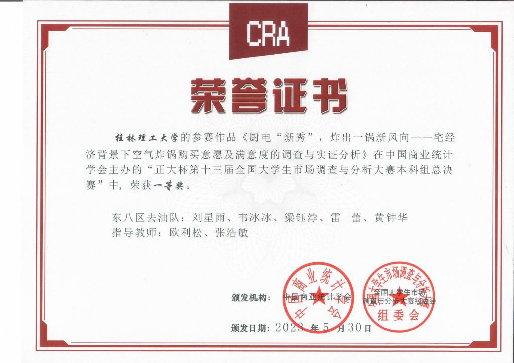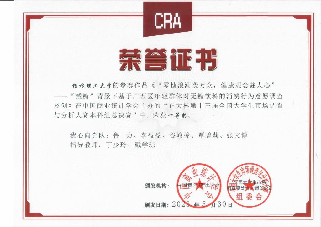 近日,由中国商业统计学会主办、正大集团冠名的“正大杯”第十三届全国大学生市场调查与分析大赛落下帷幕,beat365参赛队伍在本届大赛中斩获佳绩。研究生组总决赛中,由beat365理学院应用统计专业研究生华思滢、刘人庆、刘盼盼、李思博、刘添鑫共同完成的参赛作品《“果”熟蒂落,寻味“永富”——广西地方助农类果干产品市场定位与消费者行为研究》荣获全国一等奖。本科组总决赛中,由理学院应用统计与市场营销专业本科生刘星雨、韦冰冰、梁钰浡、雷蕾、黄钟华共同完成的参赛作品《厨电“新秀”,炸出一锅新风向——宅经济背景下空气炸锅满意度及购买意愿的调查与实证分析》,应用统计与信息与计算科学专业本科生鲁力、李盈盈、谷峻樟、覃碧莉、张文博共同完成的参赛作品《零糖浪潮袭万众,告别负担一身轻——“减糖”背景下对广西区年轻群体消费行为意愿的调查分析及无糖饮料创新策略分析》均荣获全国一等奖,这也是beat365本科生在此项赛事首获全国一等奖。beat365获“最佳院校组织奖”。