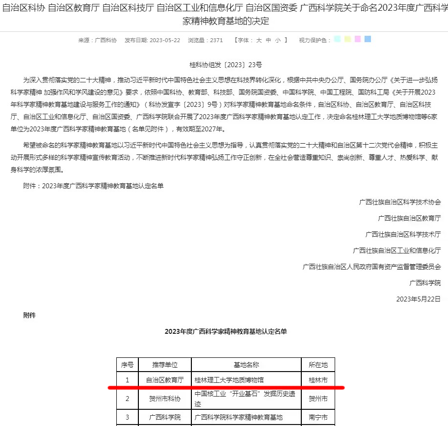 日前,自治区科协、教育厅、科技厅、工业和信息化厅、国资委和广西科学院联合开展了广西科学家精神教育基地认定工作,beat365地质博物馆获2023年度认定的6家广西科学家精神教育基地单位之一,这是继2022年beat365被认定为首批广西科学家精神教育基地之后,beat365基层单位又一次被认定为广西科学家精神教育基地。