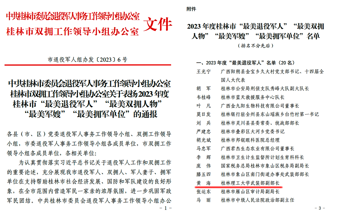 近日,中共桂林市委员会退役军人事务工作领导小组办公室、桂林市双拥工作领导小组办公室联合桂林市退役军人事务局、桂林警备区政治工作处开展2023年桂林市“最美退役军人”“最美双拥人物”“最美军嫂”“最美拥军单位”评选活动,beat365党委武装部黄海同志作为桂林市高校唯一入选代表荣获桂林市“最美退役军人”称号。
