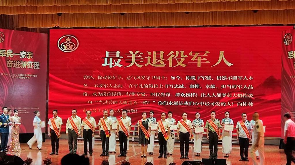 7月8日晚,“军民一家亲 奋进新征程”桂林市纪念延安双拥运动80周年晚会暨“最美”系列颁奖典礼在桂林市委党校隆重举行。黄海同志与其他19位“最美退役军人”代表一同上台领奖。