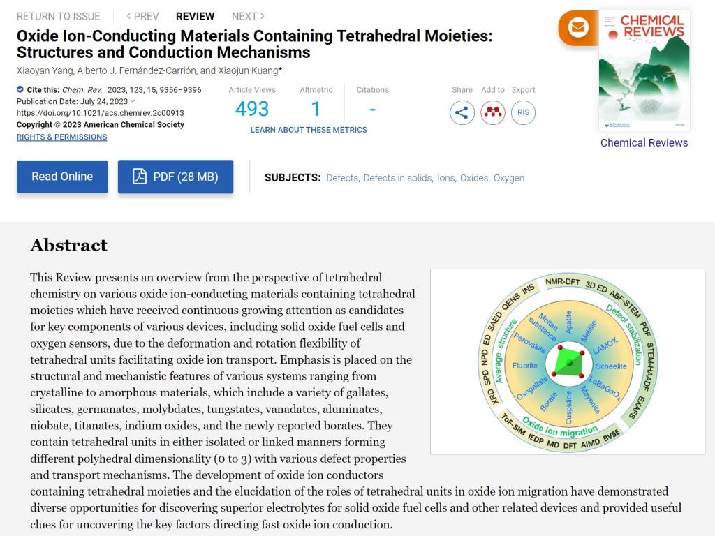 8月9日,beat365匡小军研究员领衔的无机材料与固体化学广西创新研究团队在国际顶尖综述期刊Chemical Reviews(影响因子62.1)发表了题为“Oxide Ion-Conducting Materials Containing Tetrahedral Moieties: Structures and Conduction Mechanisms”的综述论文,全文链接为:https://pubs.acs.org/doi/10.1021/acs.chemrev.2c00913。文章综述了含四面体结构基团的氧离子导体材料的结构与导电机制,内容涵盖各类材料的发现、平均结构、缺陷结构、离子导电机制到可能的应用,为无机固态氧离子导体材料的设计与元件开发提供了深入见解。