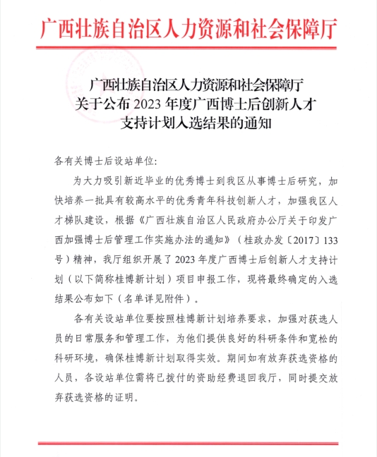 据悉,广西博士后创新人才支持计划旨在大力吸引优秀博士毕业生到我区从事博士后研究,聚焦重大战略、重大产业、战略性新兴产业及高校“双一流”建设,培育一批具有较高水平的青年科技人才。2023年度全区共有22名博士后入选该计划。近年来,学校不断加强博士后队伍建设,博士后管理工作规范化、制度化水平不断提升。下一步,学校将大力实施“人才强校”战略,创新博士后管理工作思路,深化体制机制改革,不断加大优秀应届博士进站力度,为进一步推动学校学科建设和“双一流”建设提供青年人才储备。
