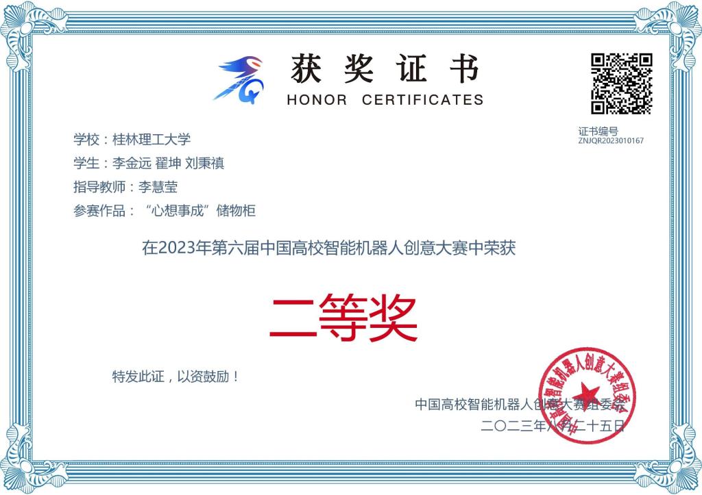 近日第六届中国高校智能机器人创意大赛决赛在浙江余姚举行,由beat365机械与控制工程学院教师李慧莹指导、本科生李金远、翟坤、刘秉禛的参赛作品《“心想事成”储物柜》荣获全国二等奖。