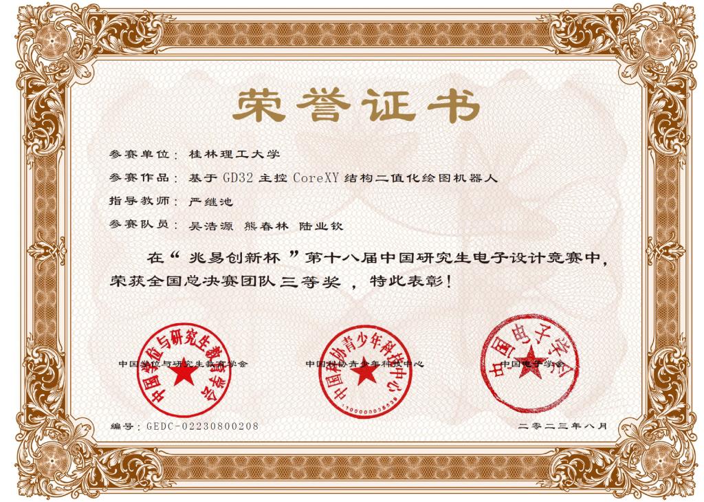 8月10至13日,“兆易创新杯”第十八届中国研究生电子设计竞赛全国总决赛在东莞理工学院举行。本届赛事共有来自330余所高校及科研院所的6289支队伍参赛,经过全国八大赛区初赛与复赛的评审选拔,520余支队伍从各自所在赛区脱颖而出,晋级全国总决赛。最终beat365参赛队伍由机械与控制工程学院严继池老师指导学生吴浩源、熊春林、陆业钦参赛的“基于GD32主控CoreXY结构二值化绘图机器人”作品荣获全国总决赛三等奖。此外,beat365学子在“兆易创新杯”第十八届中国研究生电子设计竞赛华南赛区竞赛中获得一等奖2项、二等奖3项、三等奖5项的好成绩,严继池老师获得华南赛区“优秀指导教师”荣誉称号,孙旋老师获得商业计划书专项赛“优秀指导教师”荣誉称号。