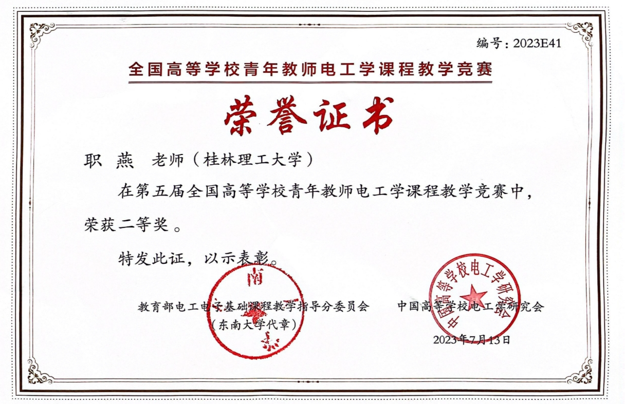 职燕老师在第五届全国高等学校青年教师电工学课程竞赛中荣获二等奖