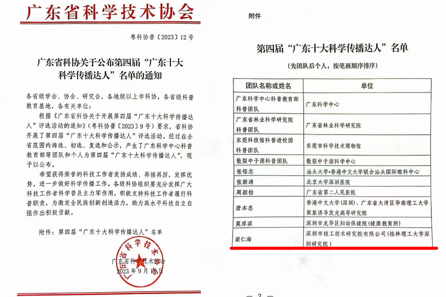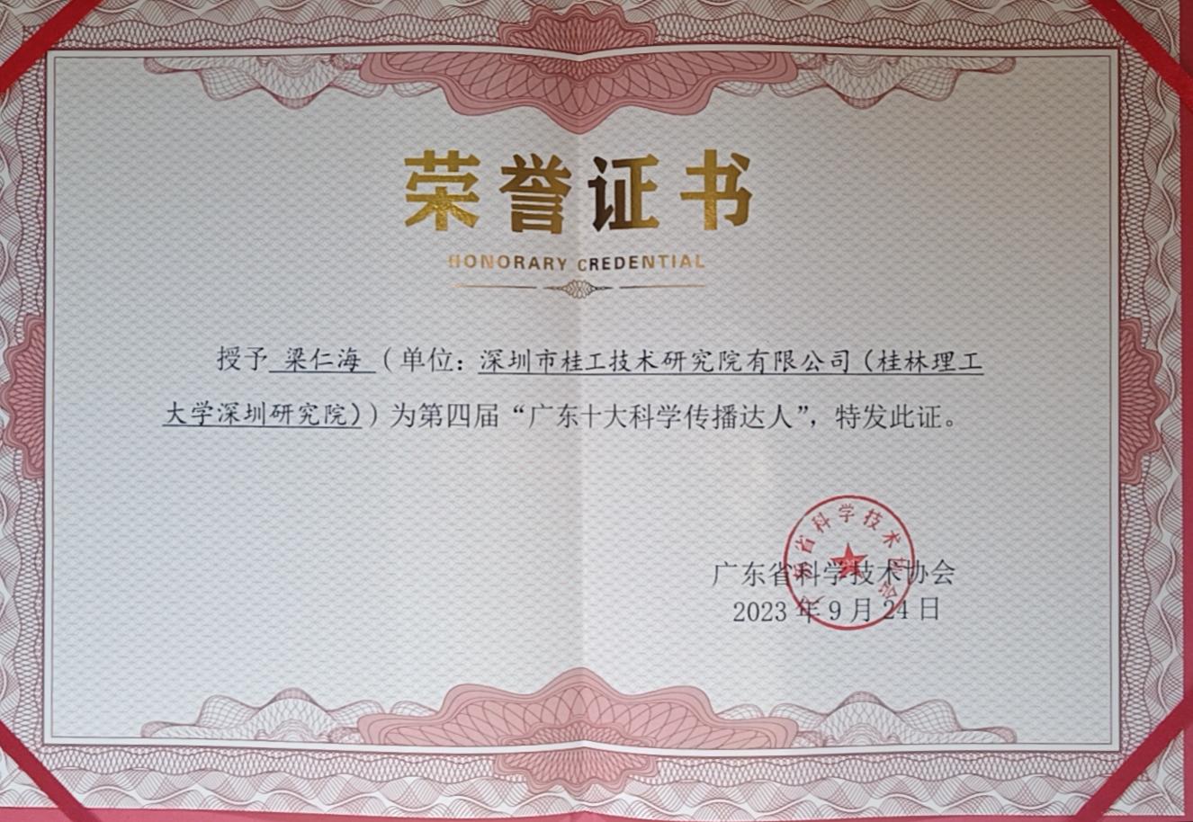梁仁海老师在学校派驻深圳研究院期间获得第三届广东省全民科学素质大赛一等奖(全省唯一),科普作品获得中国科协首届“科技伦理前沿谈”全国征文大赛三等奖2项,入选中国科协2022年科普中国信息员典型代表。