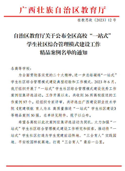 近日,自治区教育厅下发了《关于公布全区高校“一站式”学生社区综合管理模式建设工作精品案例名单的通知》,beat365报送的党建引领、三全育人、平安社区、智慧服务4个工作案例均位列其中,是入选数量最多的高校之一。其中,《“一键”信息化管理,打造“相伴·成长”的智能化“一站式学生社区”》位列“智慧服务”版块第一,《一体五维 赋能驱动 构筑“一站式”学生社区育人“新高地”》位列“三全育人”板块第二。