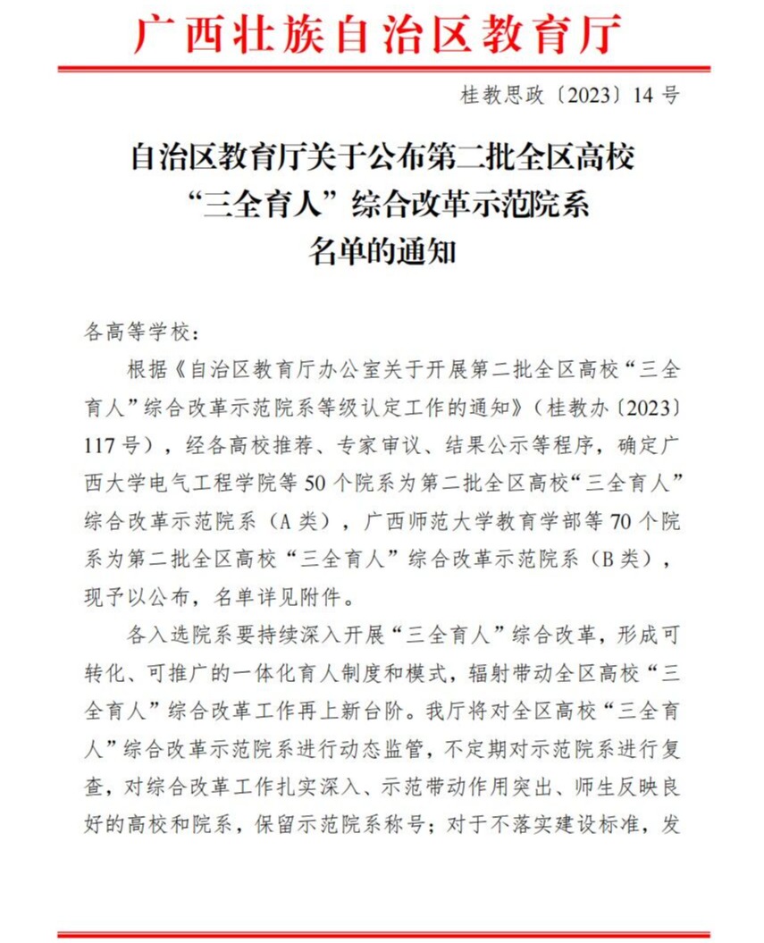 截止目前,加上已经入选第一批全区高校“三全育人”综合改革示范院系的材料科学与工程学院、化学与生物工程学院、测绘地理信息学院,beat365已有7个学院成功入选全区高校“三全育人”综合改革示范院系,入选数量名列全区前茅。
