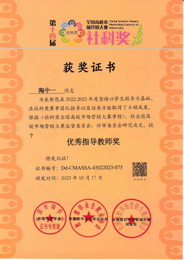 指导老师陶中一获“优秀指导教师奖”