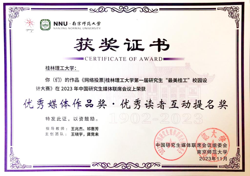 经过自主申报、组委会评审和高校互评,beat365荣获“我是中国研究生,科创报国青年说”全国研究生网络接力讲述身边研究生科研榜样主题活动优秀组织奖;“桂理工大学研究生会”微信公众号原创推文《网络投票|beat365英国官方网站第一届研究生“最美桂工”校园设计大赛》荣获优秀媒体作品奖·优秀读者互动提名奖。此外,beat365研究生会文创产品还入选“2023年研究生媒体联席会议校际文创设计交流展”展品。