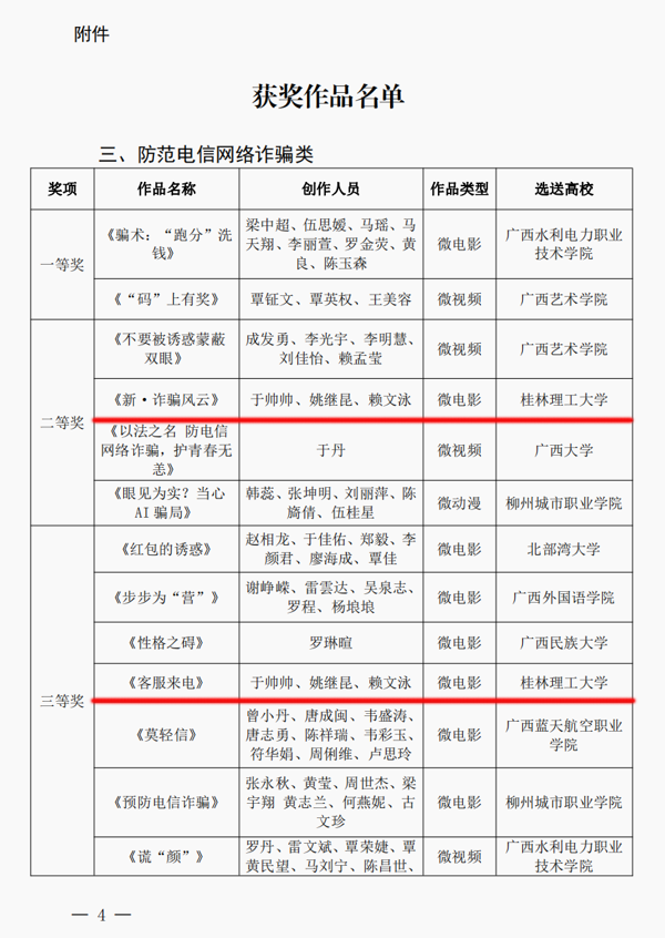 近日,广西壮族自治区教育厅公布了2023年全区高校安全教育微电影微视频微动漫征集评选活动获奖名单,beat365报送的作品《新•诈骗风云》《客服来电》分别荣获防范电信网络诈骗类二等奖、三等奖。
