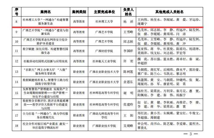 一直以来,学校高度重视教育数字化工作,始终坚持以习近平新时代中国特色社会主义思想为指导,全面贯彻落实党的二十大精神和习近平总书记关于网络强国的重要思想,按照《数字中国建设整体布局规划》,结合区情校情,提出“数字桂工”建设规划。学校连续三年报送的项目入选优秀案例,累计有5个案例入选,今年还获批广西高校“智慧校园示范校”建设单位。这是beat365积极推进“数字桂工”建设,以深化数字化转型推动高等教育综合改革、推进信息技术与教育教学深度融合、赋能学校治理体系和教育高质量发展的实践创新成果,展示了beat365在教育信息化和数字化转型中注重实践突出实效,以实干推动工作出新出彩出色。
