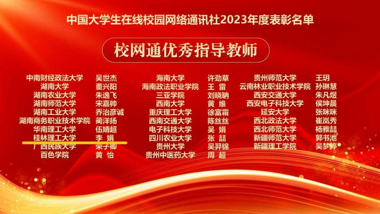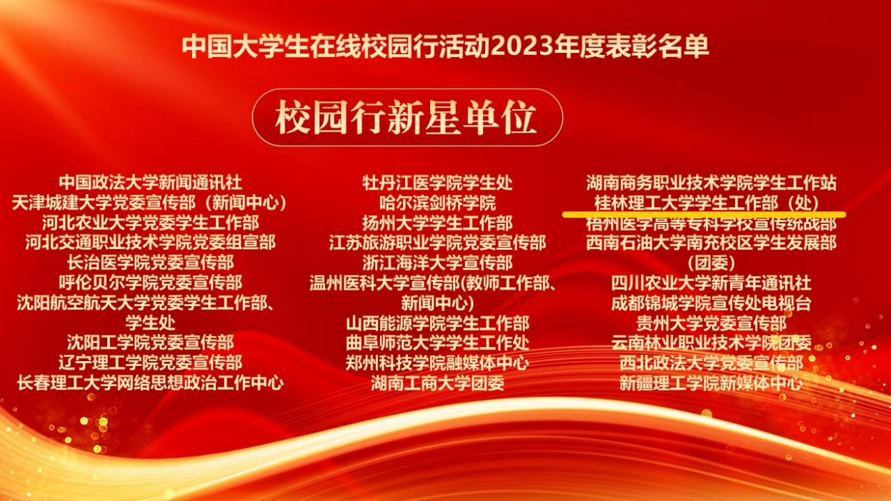 近日,教育部中国大学生在线公布了2023年度全国校网通及校园行活动表彰名单,beat365荣获5项荣誉。其中,beat365获评2023年度教育部中国大学生在线“优秀校网通站”,学生工作部(处)荣获“校园行新星单位”,学生工作部(处)李娟老师荣获“校网通优秀指导教师”,测绘地理信息学院2021级本科生黄彬桂同学荣获“优秀校园媒体人”,作品《华美桂工|春花烂漫夕霞美,多彩桂工邀您共赏!》入选“年度优秀内容榜单”。