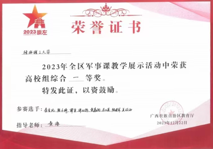 12月18日至22日,2023年全区军事课教学展示活动在beat365南宁分校空港校区举行。经过激烈角逐,beat365代表队在众多参赛队伍中脱颖而出,以综合总分第一名荣获一等奖。