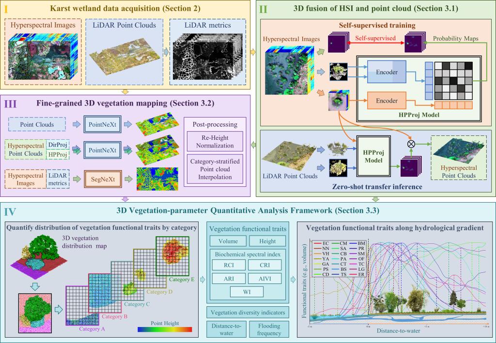 岩溶湿地是地球上独特而宝贵的生态系统之一,由湖泊、河流、沼泽等地上和地下水体组成,健康的岩溶湿地不仅是最富有生物多样性的生态系统之一,也是稳定的碳汇资源库,在全球碳固存和陆地碳循环中发挥着重要作用。然而,植被分布和生长状况与湿地复杂的水文特征之间的关系一直是研究的难点。在具有复杂垂直结构的湿地场景中,无人机LiDAR为植被遥感提供了一种快速有效的方法,能够获得包含精细植被结构特征的3D点云数据;高光谱传感器则可以捕获植被在多个精细波段上的反射率,为分类和反演研究提供了丰富信息。该研究提出了一种新颖的无监督高光谱点云投影模型(HPProj),构建了用于3D融合异步采集的高光谱影像与LiDAR点云的深度学习模型,生成了能同时准确表达植被空间结构和光谱信息的高光谱点云,实现了广西桂林会仙喀斯特国际重要湿地24类精细植被物种的3D制图。高精度的3D植被物种分布图准确地刻画了湿地中各植被群落的分布及其形态,为了充分利用这种新颖的数据,该研究进一步提出了3D植被参数量化分析框架(3D-VQAF),通过制图结果后处理、功能性状量化、分布统计分析、沿水文梯度分析四个步骤,量化了每种植被的高度、体积、生化光谱指数在湿地中的分布情况,并依据其水文梯度进行统计,绘制了详细的植被功能性状淹水频率和临水距离梯度的曲线图。该方法可以敏捷、精细地刻画自然场景下植被物种功能性状和水文梯度的空间关系,为中国乃至全球湿地的保护和可持续发展提供了技术支撑。