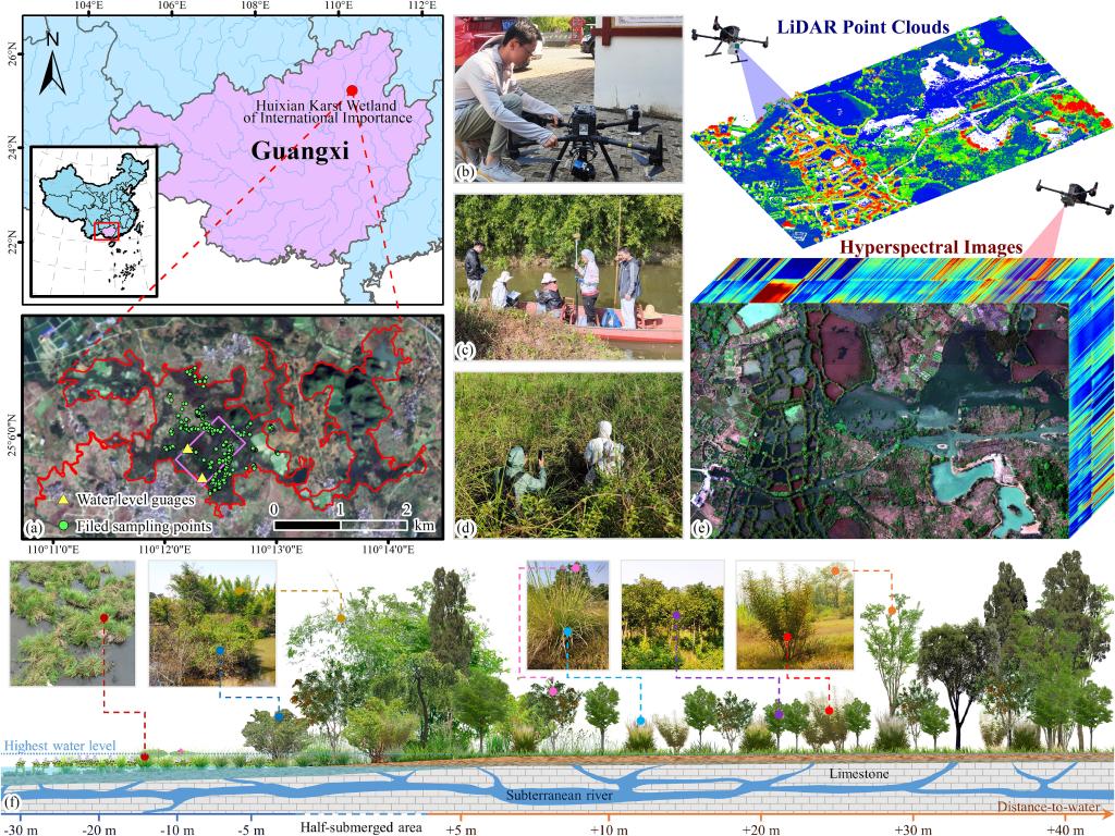 该研究提出了一种新颖的点云和高光谱融合方法,用于广西桂林会仙喀斯特国际重要湿地24类精细植被的3D制图,并首次基于3D制图结果,量化了多种湿地植被功能性状参数沿湿地水文梯度的变化趋势,为自然场景的植被研究提供了一种全新方法。
