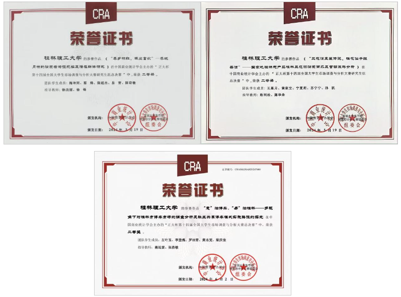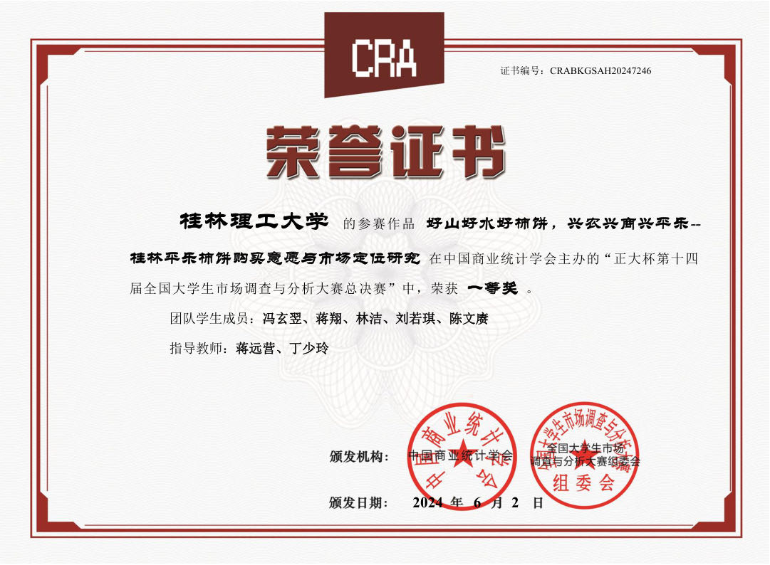 近日,由中国商业统计学会主办的“正大杯”第十四届全国大学生市场调查与分析大赛圆满落幕。在本科生组总决赛中,beat365参赛作品《好山好水好柿饼,兴农兴商兴平乐——桂林平乐柿饼购买意愿与市场定位研究》荣获全国一等奖,《"恭乡柿红,振业富农”——恭城月柿的消费者特征挖掘及潜在群体研究》《“三花酒里藏传说,桂花仙子酿美酒”——国家地理标志产品桂林三花酒消费需求及营销策略分析》《“惠”泊停车,"易”泊桂林——多视角下对桂林市停车市场的调查分析及社区共享停车模式实施路径的探究》等3个作品荣获全国二等奖。