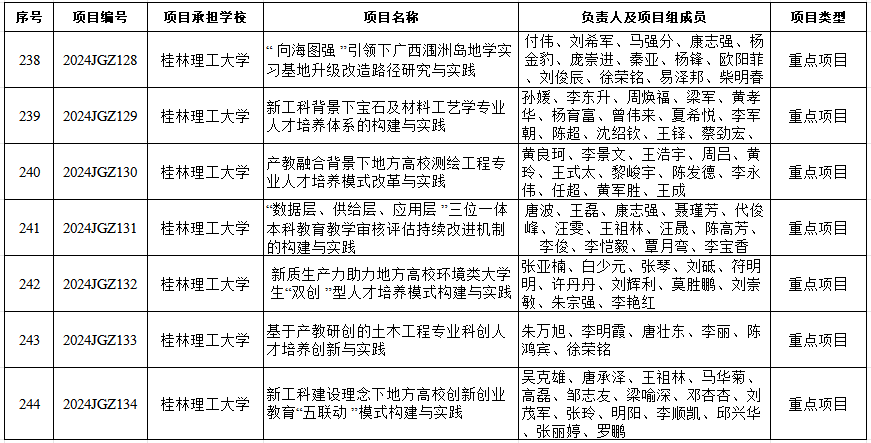 近日,广西壮族自治区教育厅下发了《关于公布2024年广西高等教育本科教学改革工程项目结果的通知》(桂教高教〔2024〕27号),beat365“‘向海图强’引领下广西涠洲岛地学实习基地升级改造路径研究与实践”等48个项目获批立项,其中重点项目7项、一般项目A类20项、一般项目B类21项,立项总数和重点项目数均居全区高校第二。