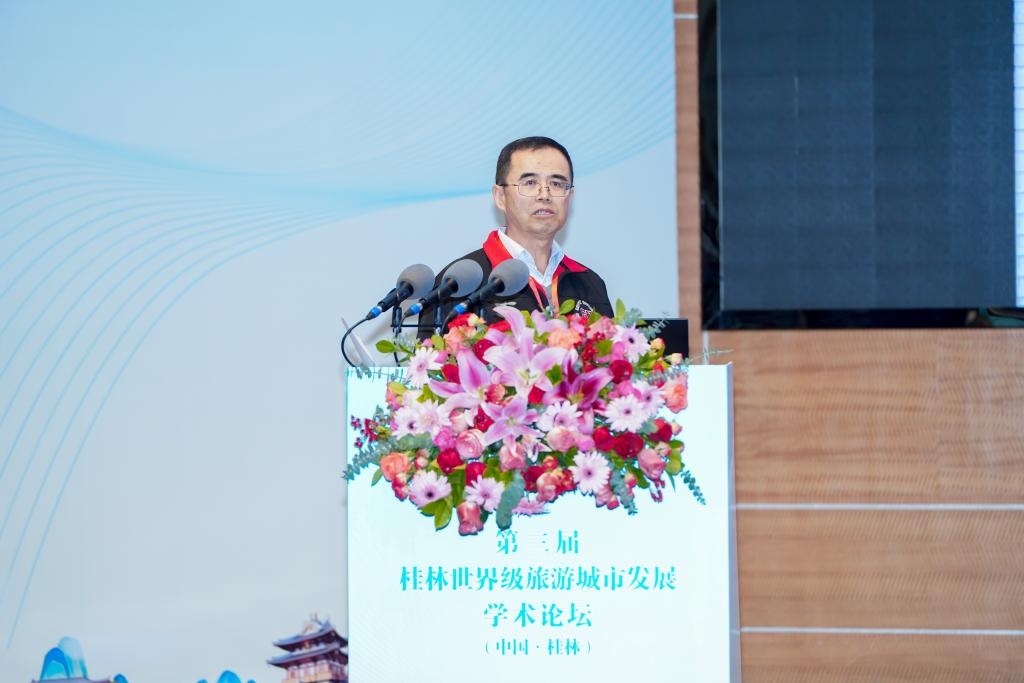 谭建国在致辞中希望广大专家学者、高校老师、社科工作者能以此次论坛为契机,自觉担负起建设世界级旅游城市的责任和使命,用桂林丰富的山水资源和厚重的历史文化,赋能桂林经济高质量发展。
