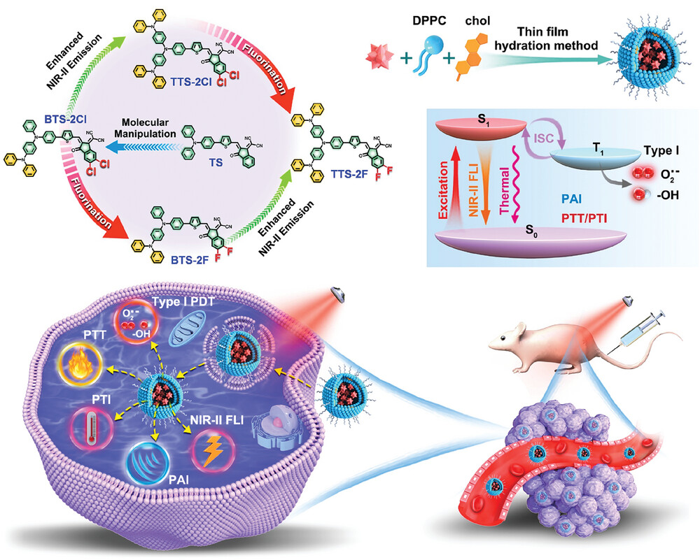 本研究充分利用聚集诱导发光(AIE)分子的结构优势,结合供体基团工程和氟化工程的策略,成功构建了一系列具有近红外二区荧光成像(FLI)、I型光动力(PDT)和低温光热(PTT)的近红外二区AIE光敏剂。多转子、扭曲结构以及低频振动形式赋予光敏剂近红外二区AIE发射特性、高效的自由基活性氧产生能力以及卓越的低温光热转换效率。体外和体内评估表明,所构筑的近红外二区脂质体可以实现在肿瘤部位的富集,同时在激光辐照下可以实现近红外二区成像模态下I型光动力(PDT)和低温光热(PTT)联合治疗,从而实现对原位乳腺癌的准确诊断和高效治疗。上述多模态治疗方案提高了癌症的治疗效果,得到了国际同行专家高度认可。