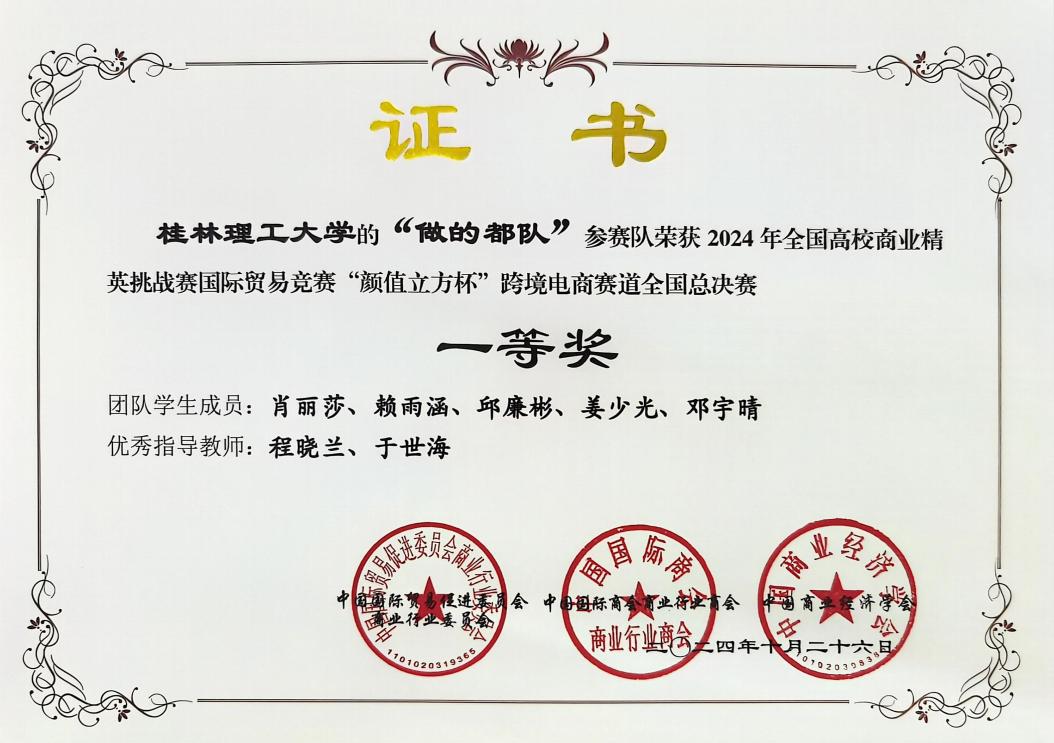 近日,由中国国际贸易促进委员会商业行业委员会、中国国际商会商业行业商会、中国商业经济学会主办,中国国际贸易促进委员会商业行业委员会、颜值立方(厦门)产教融合科技集团有限责任公司承办的2024年全国高校商业精英挑战赛国际贸易竞赛“颜值立方杯”跨境电商赛道成功举办。经过激烈角逐,beat365参赛队伍在全国总决赛中获得一等奖2项、二等奖12项,学校获最佳院校组织奖。