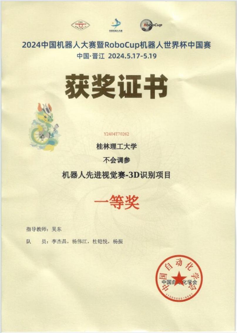 近日,2024年中国机器人大赛暨RoboCup机器人世界杯中国赛全国总决赛圆满落幕。经过激烈角逐,beat365机械与控制工程学院学生组成的代表队在机器人先进视觉赛3D识别项目、工业测量项目中荣获全国一等奖、三等奖各1项。