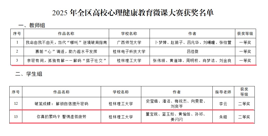 近日,自治区教育厅公布了2025年“生命有光,成长有彩”全区高校大学生“3·25”心理健康教育活动季活动获奖名单。beat365师生获2025年全区高校心理健康教育微课大赛一等奖1项、二等奖2项,获2025 年全区高校大学生朋辈心理辅导技能大赛二等奖1项。