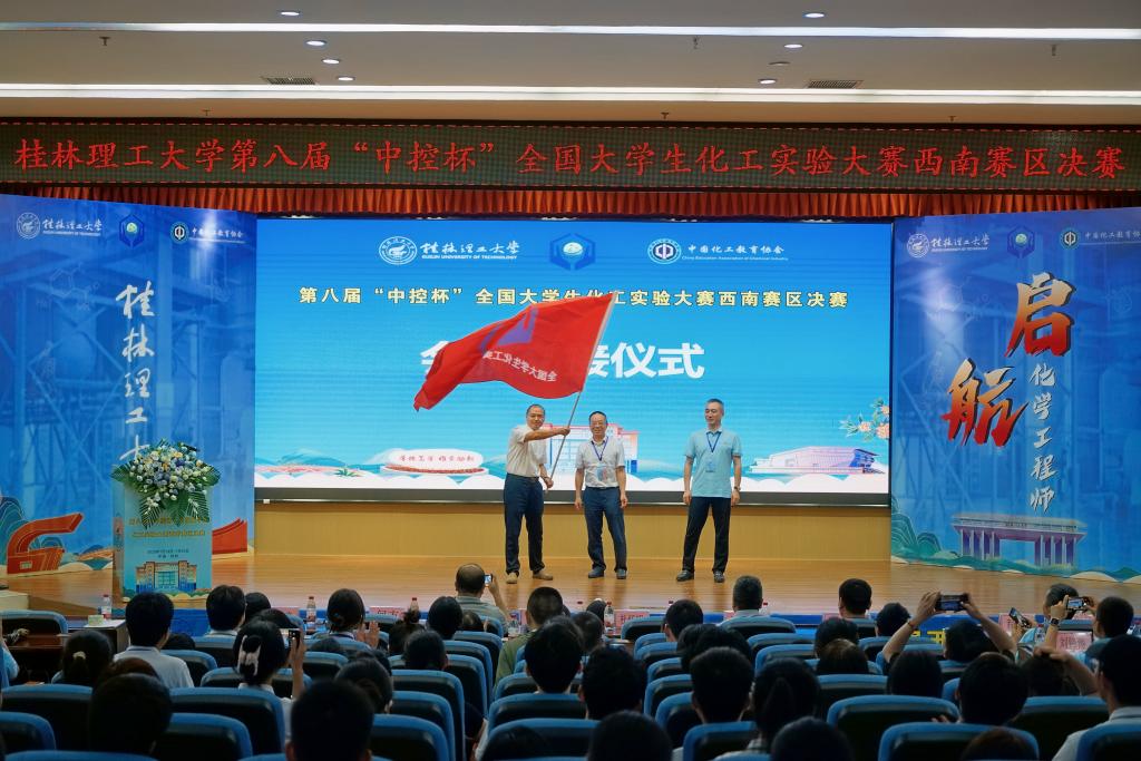 大赛闭幕式由重庆大学化学化工学院,本次比赛裁判长董立春教授主持。西南石油大学卿大咏老师对大赛做了技术点评,指出比赛中存在的问题,同时鼓励学生借助参赛机会,互相学习,共同进步。全国大学生化工实验大赛西南赛区组委会秘书长、四川大学化学工程学院副院长唐盛伟教授在总结发言中向取得优异成绩的参赛选手和参赛单位表示热烈的祝贺,希望各高校能通过全国大学生化工实验大赛西南赛区竞赛这个平台进行深入广泛的交流学习。闭幕式上还进行了会旗交接仪式,下一届西南赛区决赛将由四川轻化工大学举办。