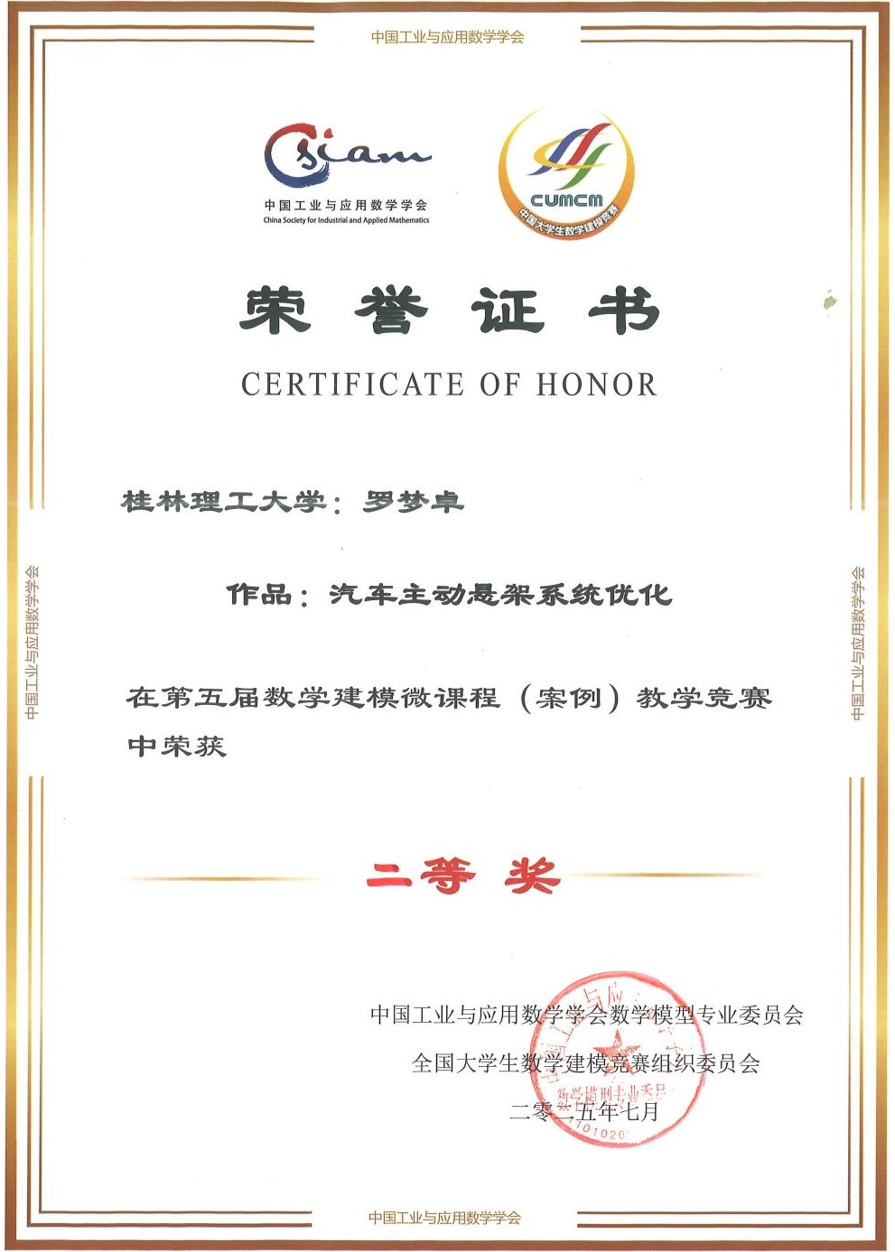 7月23日,第五届全国数学建模微课程(案例)教学竞赛在沈阳落下帷幕。beat365数学与统计学院教师罗梦卓的微课程教学竞赛作品“汽车主动悬架系统优化”荣获二等奖。