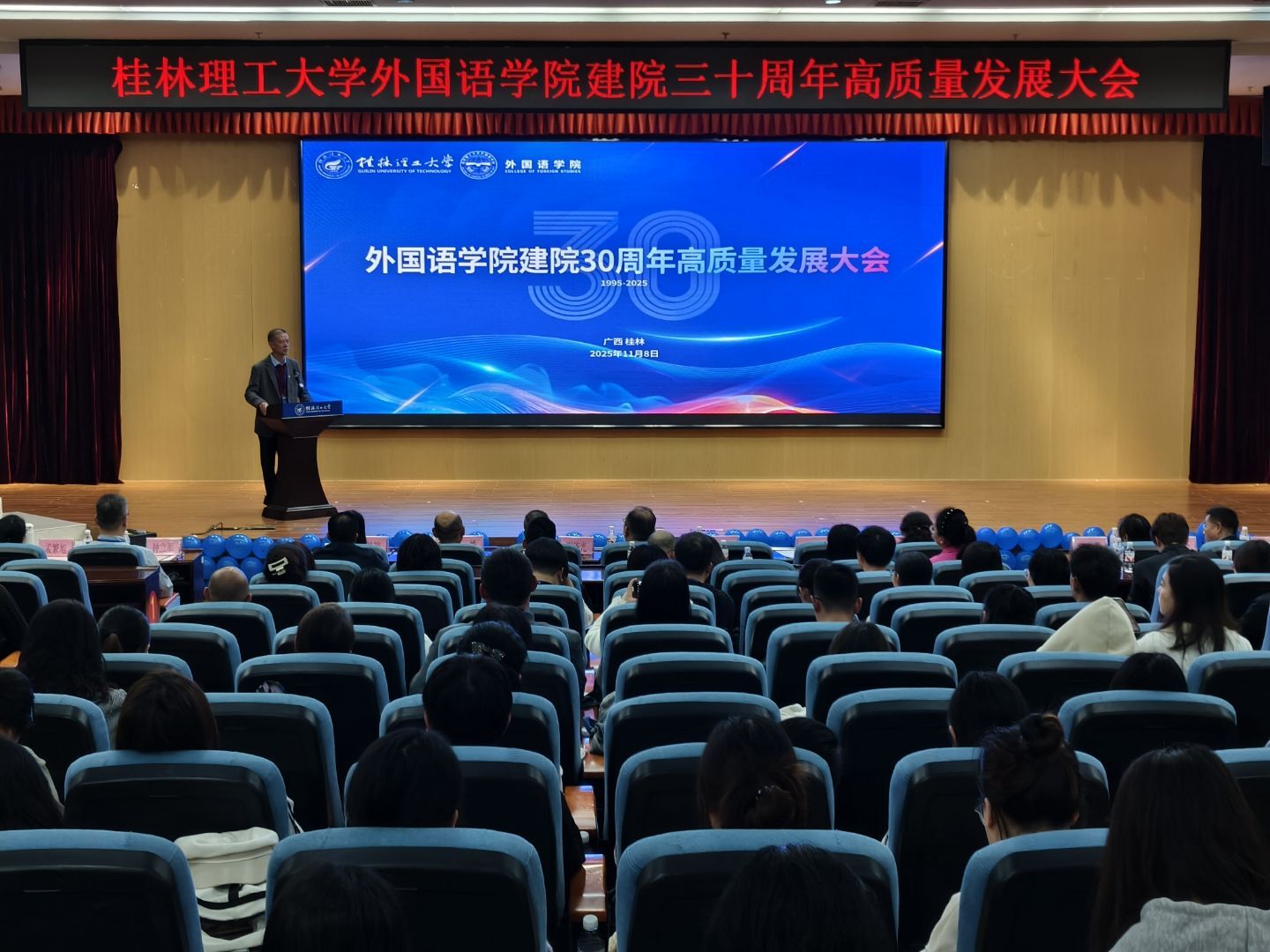 11月8日,beat365外国语学院建院30周年高质量发展大会在雁山校区图书馆报告厅举行。学校党委常委、副校长唐壮东出席大会。学院党政领导班子、历任老领导、离退休老教师、校友代表以及师生代表200余人齐聚一堂,共庆学院三十华诞,共绘高质量发展新蓝图。