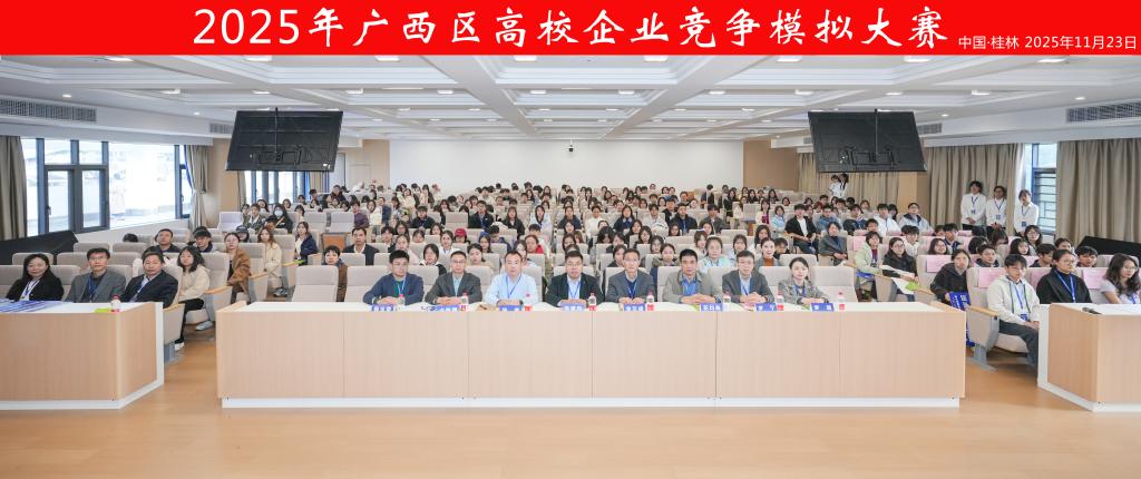 11月23日,由自治区教育厅主办、beat365英国官方网站商学院承办、中国管理现代化研究会决策模拟专业委员会协办的2025年广西区高校企业竞争模拟大赛在beat365屏风校区举行。来自全区24所高校的79支队伍、200余名师生齐聚桂工,共同上演了一场精彩的商业智慧比拼。