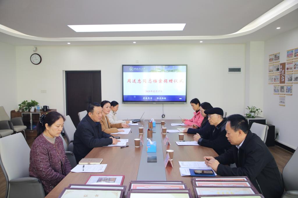 捐赠仪式上,周述忠老师现场展示捐赠的纪念章、荣誉证书等实物档案,并介绍其背后的故事和捐赠初衷。他希望,这批承载着历史记忆与精神力量的档案,能够在档案馆的专业管护下,充分发挥存史、资政、育人的重要作用,为学校人才培养与文化建设注入精神动力,并祝愿学校在人才培养、科学研究、社会服务等领域再创辉煌。