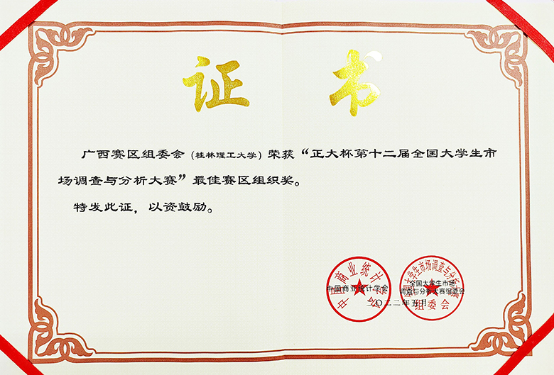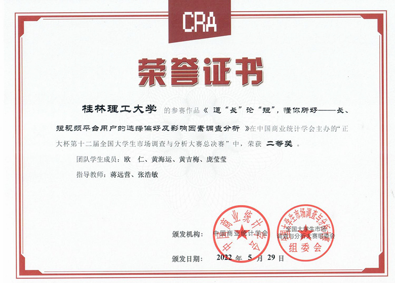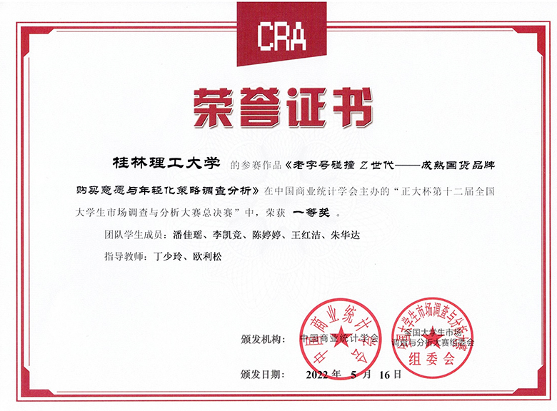 5月底,“正大杯”第十二届全国大学生市场调查与分析大赛研究生组和本科生组总决赛在线上圆满闭幕,beat365参赛队伍在本届大赛中斩获佳绩。在研究生组比赛中,由丁少玲老师、欧利松老师指导,理学院统计学和应用统计专业研究生潘佳瑶、李凯竞、陈婷婷、王红洁、朱华达等5名同学共同完成的参赛作品《老字号碰撞Z世代——成熟国货品牌购买意愿与年轻化策略调查分析》斩获全国一等奖;本科组比赛中,由蒋远营老师、张浩敏老师指导,理学院应用统计专业欧仁、黄海运、黄吉梅、庞莹莹等4名同学共同完成的参赛作品《道“长”论“短”,懂你所好——长、短视频平台用户的选择偏好及影响因素调查分析》荣获全国二等奖,由欧利松老师、蒋远营老师指导,应用统计及人力资源管理专业周毅、梁玫珊、黄春松、林诗欣等4名同学共同完成的参赛作品《共享盛宴,汽车可羹?——桂林市共享汽车用户特征挖掘及其使用意愿研究》荣获全国二等奖。同时,beat365荣获最佳赛区组织奖。