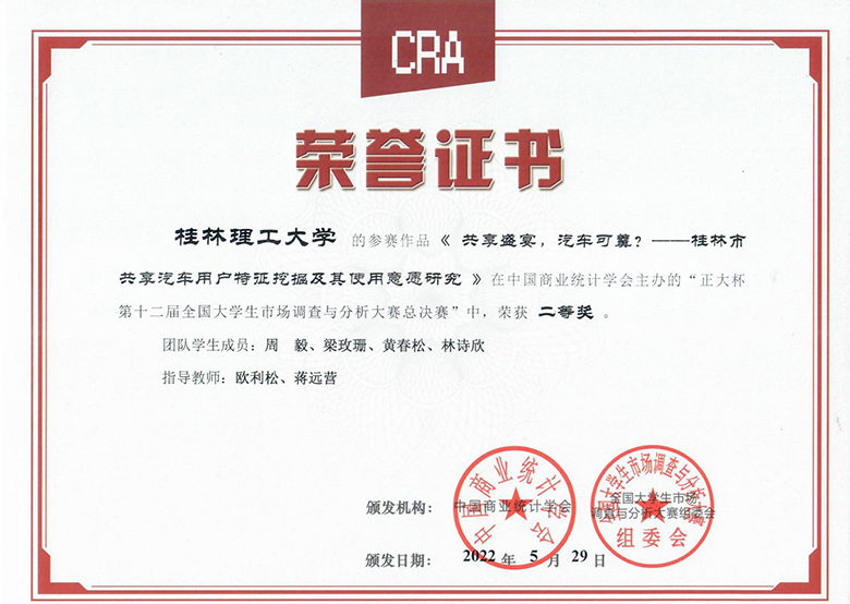作品《共享盛宴,汽车可羹?——桂林市共享汽车用户特征挖掘及其使用意愿研究》荣获全国二等奖
